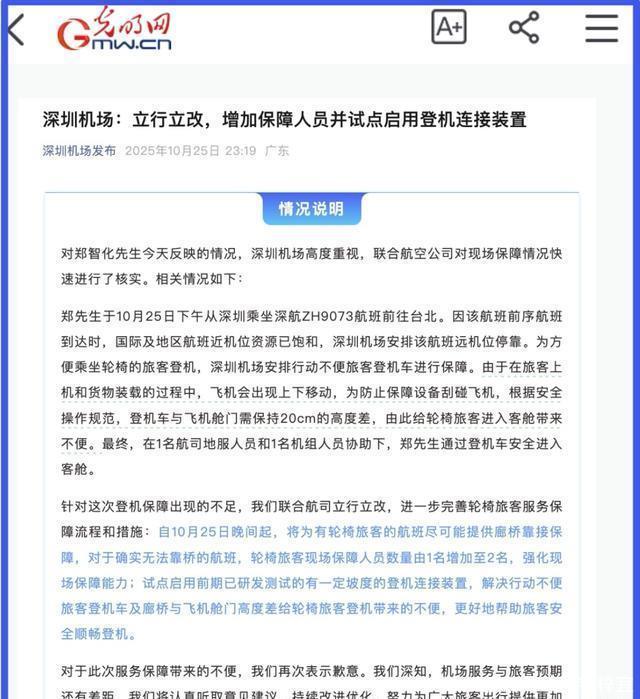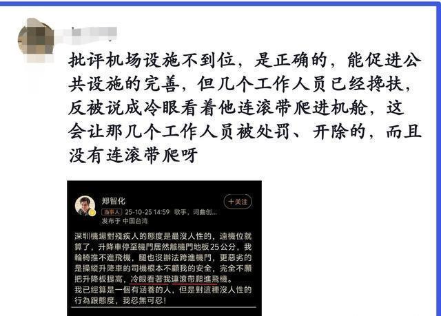 登机连接装置在别的机场早就有各种方式的应用了,为什么得不到深圳机场的重视呢? 还有那些不仅不认为机场有错,还指责郑智化的网友们,他们是真不知道残障人士的艰难啊! 因为他们看不到,也不能感同身受我们身边残疾同胞的艰难,就理所当然地认为公共场所的无障碍设施可有可无,甚至还帮着违法违规的机场说话,以至于连机场这样的营利公共场所都对此毫不在乎,到底是谁的悲哀呢? 这个时候就没有人谈资本了吗? 虽然旅客在机场面前中并非法律意义上的弱势群体,但因为信息不对称、服务依赖度高,本来航空消费者在实际维权时就处于被动地位,维权成本高,维权难度大,导致很多人就自动放弃了维权。 郑智化显然是并不想投诉机场的,但是就是发了个牢骚,居然引起了同是消费者的网民对他的网暴,真的是太奇怪了。 还有很多人义正言辞地说有几个工作人员搀扶他,郑智化的话会让工作人员被处罚开除。 可机场流出的视频证明明明是从头到尾只有一个人搀扶他,他们是多么会歪曲事实啊!