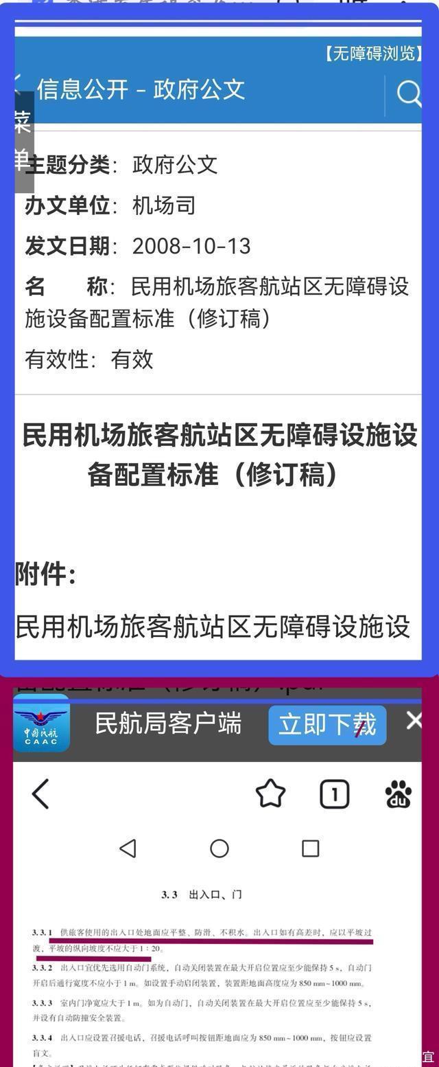 整个过程看着都让人很揪心,只要人心还是肉长的,就一定能够感受他那一刻的艰难和狼狈,如果他是我们的兄弟,我们一定会感到很难过。 也一定会很生气,因为这一切都是不应该发生的。 我国的《民用机场旅客航站区无障碍设施配备标准(修订稿)》17年前就规定了机场的各出入口应该平整,有高差的时候应该以平坡过渡: